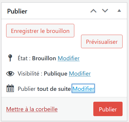 titre de votre articledans le champ supérieur et saisissez lecontenu de votre articledans la zone d’édition principale en dessous. Ajouter unorganisateuret unservicesi besoin (bloc "Événements"). Définissez laVisibilitéde la publication, unedate de début, unedate de fin, unlieu, éventuellement desinformations pratiqueset uneimage mise en avantqui servira de couverture à votre évènement. - Quand vous avez terminé, cliquez sur le bouton "Publier".