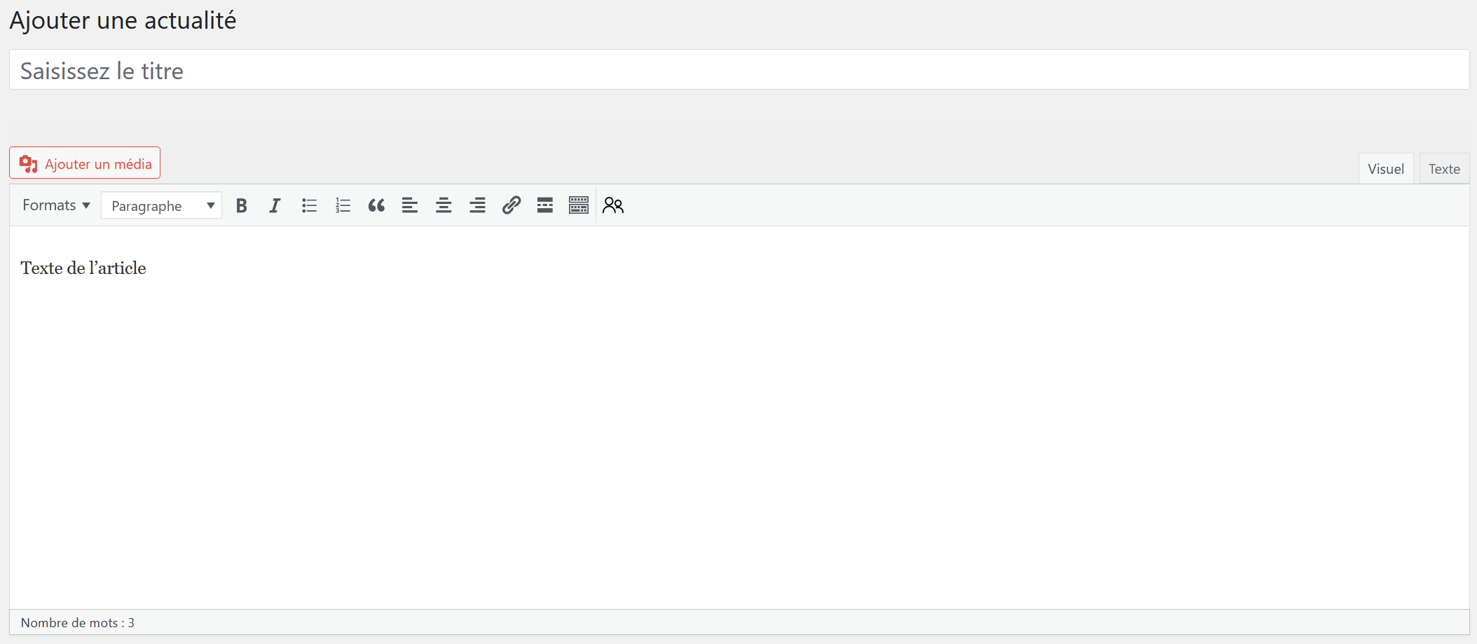 Titre : Ce premier champ doit contenir le titre de votre article. Vous pouvez utiliser n’importe quelle phrase, mots ou caractères (évitez d’utiliser le même titre sur plusieurs articles). Vous pouvez utiliser des virgules, des apostrophes, des guillemets, des traits d’union/tirets et d’autres symboles. Ne pas utiliser d'émoji !