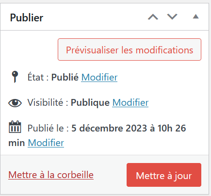 titre de votre articledans le champ supérieur et saisissez lecontenu de votre articledans la zone d’édition principale en dessous. Ajouter unorganisateuret unservicesi besoin (bloc "Événements"). Définissez laVisibilitéde la publication, unedate de début, unedate de fin, unlieu, éventuellement desinformations pratiqueset uneimage mise en avantqui servira de couverture à votre évènement. - Quand vous avez terminé, cliquez sur le bouton "Publier".