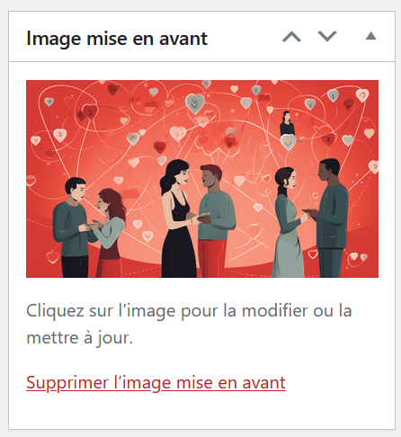 Cliquez sur "Définir l’image mise en avant" pour téléverser votre image ou utilisez en une déjà présente de la bibliothèque du portail. Si une image est définie, cliquez sur "Retirer l’image mise en avant" pour la supprimer.